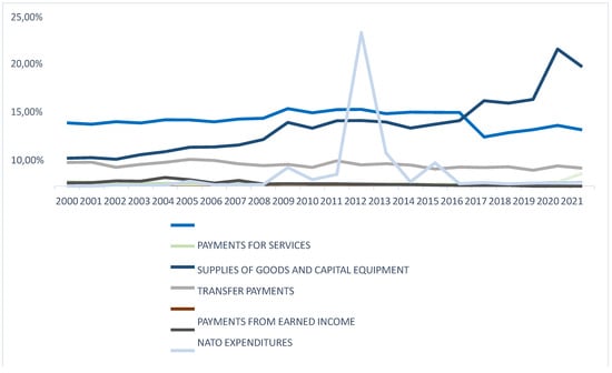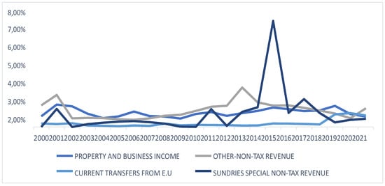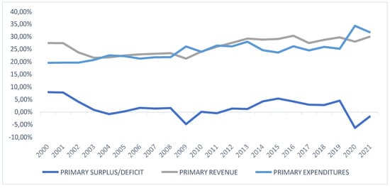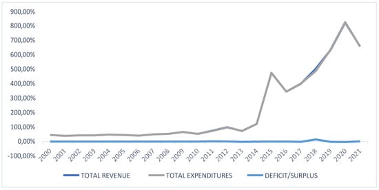 The data of our investigation mainly came from the Greek ministry budget execution from 2000 to 2021 and the GDB from the Hellenic Statistical Authority, which we define as real growth DRGDP. The data refer to the state’s revenues and expenses, and the amounts have been converted into euros using the fixed rate: 1 euro = 340.75 drachmae. To obtain a general overview of the state’s budget, we transformed the national accounts into a uniform form before 2019.