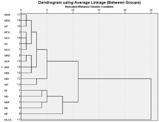 Moreover, we used the hierarchical cluster method as outlined in (); this method creates a tree-like diagram of the data, called a dendrogram, to show the arrangement of clusters at different levels. It starts with each data point in its cluster and then merges the closest clusters iteratively until there is only one cluster left. It provides a visual representation of the data’s hierarchical structure, which can help us understand relationships at different levels of granularity. The agglomerative method is a “bottom-up” approach, where each observation starts in its cluster, and pairs of clusters are merged as one moves up the hierarchy. Considering potential outliers, the average linkage method might be more robust. It can handle outliers better compared to other methods like Ward’s method. In terms of distance metrics, we used the Euclidean distance; since our data are standardized (all in thousands of euros) like z-scores, Euclidean distance should work well.