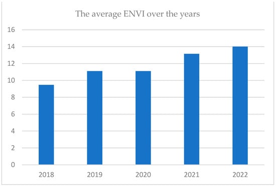 Figure 1 provides an overview of the level of environmental accounting information disclosure by listed companies in Vietnam from 2018 to 2022. The average ENVI index increased over the years, rising from 9.47 in 2018 to 14 in 2022, an increase of 47.89%. This is a positive sign, indicating that Vietnamese companies are becoming more concerned about environmental information disclosure. Especially in the 2021–2022 period, the average index increased more rapidly compared to the previous period. The average index in 2020 increased by 17.25% compared to 2018, from 9.47 to 11.1. Meanwhile, the rate of increase in 2022 compared to 2020 was even higher, at 26.13%, going from 11.1 to 14. This may be due to the issuance and enforcement of Circular 96/2020/TT-BTC, which has increased legal pressure on listed companies and raised awareness of environmental accounting practices and disclosure.