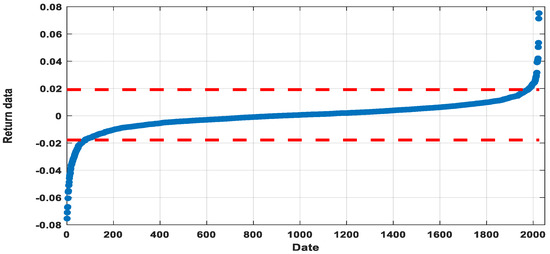 The outliers are first detected in the return data using the Tukey method based on the upper and lower fences. These computed values are respectively 0.01908 and −0.01783, and they are shown in Figure 2. Any return value that is outside the band delineated by the dashed lines is regarded as an outlier.