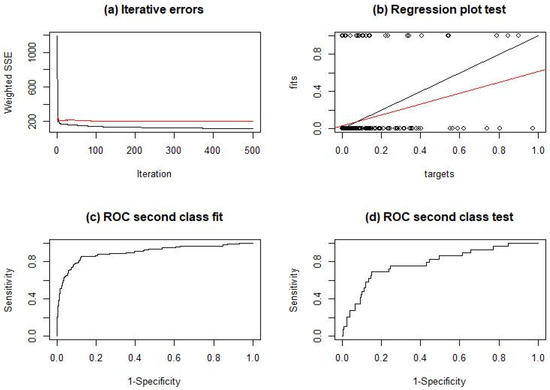 (a) Plot of the iterative fit error (black) and the iterative test error (red). (b) The regression plot for the test data. For an ideal classification, only the points (0, 0) and (1, 1) would be populated. (c) ROC plot for the second class against all other classes in the training set. (d) same as (c), but for the test data.