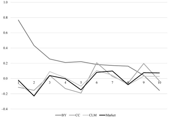 - Fama, Eugene Francis, and Kenneth Ronald French. 1988. Permanent and temporary components of stock prices. Journal of Political Economy 96: 246–73. [Google Scholar] [CrossRef]