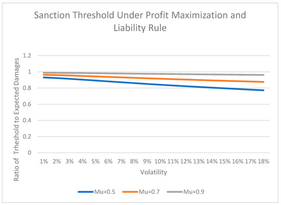 This value indicates the profit-maximizing level of the cost of protection for the firm affected by the liability option. However, it must be noted that this cost is not fixed but must be adjusted continuously to reflect the current value of the damage. By substituting into Equation (12), we obtain the expression for the threshold of the sanction with the firm pursuing optimal cost adjustment under a liability rule. By substituting the result given by (16) into (12), we obtain the expression for the sanctioning threshold conditioned by the profit maximizing firm: