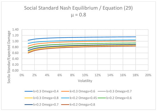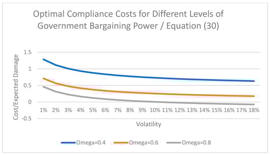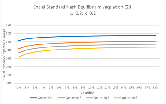The value of the social standard (the maximum tolerable level of damage over which public intervention may be considered feasible) indicated by this expression decreases with the weight of public interest ( and increases with the private weight ). Thus, the solution indicated by (29) is a compromise between a more stringent standard sought by the public authority and the more lenient one desired by private business. As shown by Figure 4 and Figure 5, the equilibrium standard is not very sensitive with respect to uncertainty over a value of volatility between 3% and 5% but shows considerable changes in response to the parameters reflecting the parties’ bargaining power (the omega parameter) and the public costs associated with upholding the standard (the k parameter).