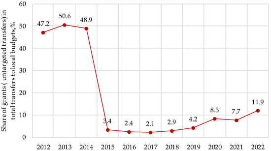 The decentralization reform of 2015–2020 envisages the creation of conditions for regional development by forming 1469 municipalities through the consolidation (amalgamation) of budgets of over 11,000 small settlements, assigning a larger percentage of state taxes to them, and delegating a larger volume of expenditure responsibilities to them to address the majority of issues locally. The system of state transfers was also reformed: the equalization of vertical fiscal imbalances (arising from the mismatch of financial resources of the local budget with the volume of subnational expenditures for the provision of social services) is carried out by providing target transfers from the state budget to local budgets; equalization of horizontal fiscal imbalances (arising from differences in the tax potential of administrative-territorial units due to objective economic, historical, natural, geographic, and other development features) is carried out by providing local budgets with non-targeted transfers—grants. To strengthen the financial base of local budgets, the regulation system for horizontal fiscal imbalances was changed from equalization by expenditure to equalization by revenue, resulting in a significant decrease in the share of non-targeted grants (Figure 2) and an increase in target transfers, accordingly.
