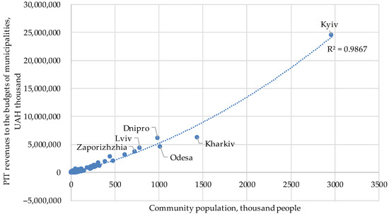 Graphical interpretation of the function of dependence of PIT revenues to the municipal budget on the population of the territorial community in 2021.