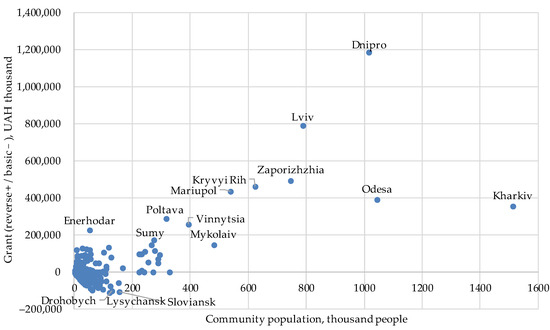 Due to the presence of a corresponding resource base—industrial potential, highly qualified personnel, developed institutions, and a comparatively better demographic situation—the largest financial resources traditionally accumulate in the budgets of regional centers, which, after the local elections of 2020, became urban territorial communities and currently are the largest donors of reverse grants. In 2022, reverse grants were transferred to the state budget by 207 municipalities, which constitutes 15% of their total number (Figure 5). Moreover, 45% of all paid reverse grants are attributed to the top 10 “donor” cities: Dnipro (12.4%), Lviv (8.2%), Zaporizhzhia (5.1%), Kryvyi Rih (4.8%), Odesa (4.1%), Kharkiv (3.7%), Poltava (3%), Vinnytsia (2.7%), as well as Mariupol and Energodar (Table 2; Figure 5), imposing significant burdens on them and serving as a disincentive.