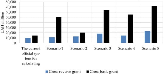 The inclusion of the largest donor—the budget of the city of Kyiv—into the equalization formula will allow to reduce the burden on other donors of reverse grant, as demonstrated in Table 1, where the calculation of grant amounts is carried out both according to the government scheme (Scenario 2) and with updated data on tax revenues for 2021 (Scenario 3). In this case, if reverse and basic grants for 2022 are calculated according to Scenario 2, the need for a basic grant will be covered by a reverse grant at 62.7%. That is, the burden on the state budget will not significantly increase (Figure 6), and the system of equalizing fiscal imbalances will correspond to the criteria of fairness and completeness, in accordance with the principles of budgetary system construction, as outlined in the Budget Code of Ukraine (Budget Code of Ukraine 2010). At the same time, the growth rate of the gross basic grant (38%) will exceed the growth rate of the reverse grant (32%), indicating a movement of the equalization system towards further reducing the stability of the public finance system.