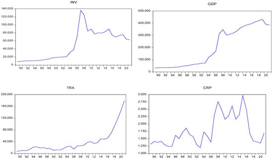 In this study, annual time series data spanning the period 1989–2021 were used. The variables invl, gdpl, tral, and crpl were used, which are the primary explanatory factors that wield significant influence on domestic investment in Dubai, particularly gross domestic product (GDP) and UAE trade openness. This is demonstrated by data on merchandise exports and imports, which show Dubai’s nonoil foreign trade constitutes about 75% of the UAE’s total nonoil trade (https://www.moec.gov.ae/en/open-data, accessed on 5 July 2023) The definitions and sources of the variables are reported in Table 1. The variable data were transformed into logarithms to address the heteroskedasticity problem (Khan et al. 2019).