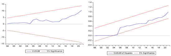 Furthermore, Figure 2 illustrates the results of the CUSUM and CUSUMSQ statistics stability tests (Brown et al. 1975) to determine trajectory significance at the 95% confidence bounds. It indicates the rejection of the null hypothesis. Consequently, we infer that all parameters in this regression are stable.
