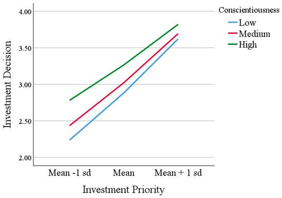Conscientiousness moderates the relationship between investment priority and investment decision-making such that the relationship between investment priority and investment decision-making becomes stronger (weaker) when the risk tolerance is higher (lower).