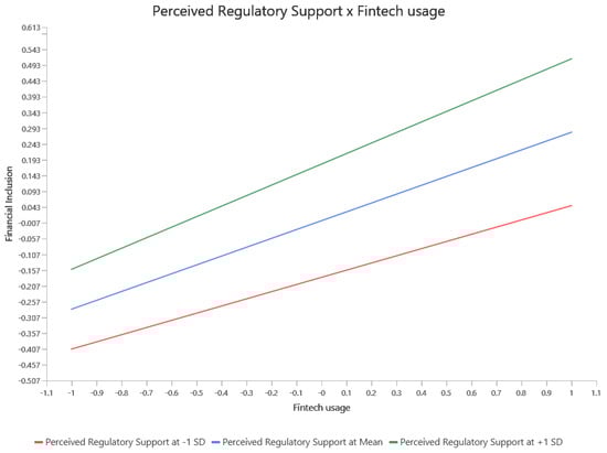 The results also demonstrated that the FinTech use and financial inclusion relationship has the moderation effect of perceived regulatory support (β = 0.053; p < 0.01), supporting H4a. Figure 2 shows that the correlation between FinTech usage and financial inclusion is stronger when there is a high perceived level of regulatory support, as compared to moderate or lower levels of perceived regulatory support. Moreover, when Fintech usage escalates from low to high, the relationship between FinTech usage and financial inclusion becomes stronger, especially when there is high perceived regulatory support in contrast to moderate or low perceived regulatory support. The variation in the slope of the curve provides additional evidence for supporting the moderation hypothesis (H4a).