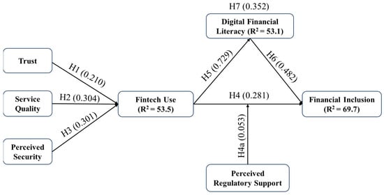 We proceeded to evaluate the hypotheses of the research after establishing the validity of the measurement model. Table 4 presents the results of the hypotheses test, which revealed significant positive effects of trust (β = 0.210; p < 0.001), service quality (β = 0.304; p < 0.001), and perceived security (β = 0.301; p < 0.001) on FinTech use; therefore, H1, H2, and H3 were accepted. Similarly, the results indicated that FinTech use (β = 0.281; p < 0.001) exerted a positive and significant impact on financial inclusion. Hence, H4 was supported. Regarding the relationship between FinTech use and digital financial literacy, the results indicated that FinTech use had significant positive impact on digital financial literacy (β = 0.729; p < 0.001), which validated H5. The findings also demonstrated the significant effect of digital financial literacy on Financial Inclusion (β = 0.482; p < 0.01), thereby supporting H6. The findings indicated a substantial mediation effect of digital financial literacy (β = 0.352; p < 0.001) in the FinTech use and financial inclusion relationship; therefore, H7 was supported.