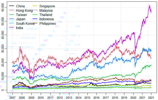In order to study the risk spillovers between the Chinese and Asian stock markets, this paper selects the stock market indexes of 11 Asian countries (regions) as the research objects, based on data availability. The selected stock market indexes are as follows: Shanghai and Shenzhen 300 Index (China), Hang Seng Index (Hong Kong), Nikkei 225 Index (Japan), TSEC weighted index (Taiwan), KOSPI Composite Index (South Korea), S&P BSE SENSEX (India), Straits Time Index (Singapore), FTSE Bursa Malaysia KLCI (Malaysia), Jakarta Composite Index (Indonesia), Stock Exchange of Thailand Index (Thailand), and Philippines Stock Exchange Index (Philippines). The data are sourced from Investing.com and Yahoo Finance, covering 1 January 2007 to 31 December 2021. Moreover, the stock return series are calculated by where is the daily close price at time .