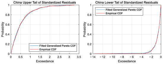 where , , and indicate the shape, scale, and lower and upper thresholds, respectively. is the total number of samples, and is the number of samples that exceed the thresholds. is the standardized residuals filtered by the AR(1)-GJR-GARCH(1,1) model, and is the empirical distribution function.