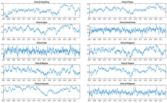 Figure 3 illustrates that the dynamic dependence of Chinese and other Asian stock markets has significant time-varying characteristics. According with Liu (2020), Chopra and Mehta (2022), and Li et al. (2022), this paper divides crisis events into the global financial crisis (2007–2009), the European debt crisis (2009–2012), the Chinese stock market crash (2015–2016), the China–US trade war (2018–2019), and the COVID-19 pandemic (2020–2021). During the 2007–2009 global financial crisis and the European debt crisis, Chinese and other Asian stock markets maintained a strong dependence. However, during the 2015–2016 Chinese stock market crash, the China–US trade war, and the COVID-19 pandemic, dynamic dependence experienced abnormal volatility, showing that the dependence dropped sharply and then rose rapidly.