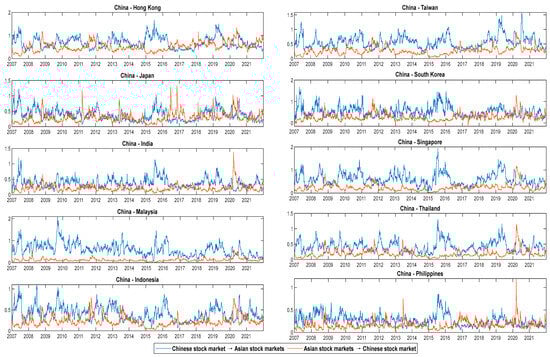 Firstly, the risk spillovers from China to other Asian stock markets are heterogeneous, in order from strong to weak: Hong Kong, Malaysia, Singapore, Taiwan, South Korea, Thailand, Indonesia, Japan, India, and the Philippines. Specifically, China has the strongest risk spillover intensity to the Hong Kong stock market at 69.05%. China’s risk spillovers to Malaysia and Singapore among the five ASEAN countries are the strongest at 59.86% and 59.71%, respectively, but the weakest to the Philippines at 26.79%. This result may be because China is Malaysia’s largest source of investment and had been Malaysia’s largest trading partner for 13 continuous years by 2021. In addition, since 2013, Singapore has been China’s largest foreign investor, and China has been Singapore’s largest trading partner. The risk spillover intensity of China to the Philippine stock market is the weakest, which may be because the limited resources of the Philippines make China’s investment in it relatively unusual, so the scope of the capital impact is negligible.