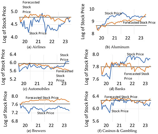 Figure 1 shows actual sectoral returns and predicted sectoral returns during the megacrisis period that began with the pandemic. Table 2 compares the root mean squared error (RMSE) from forecasts obtained using the macroeconomic variables with forecasts obtained using autoregressive integrated moving average (ARIMA) models. In all but three cases, the RMSE in column (2) for the model forecasted using macroeconomic variables is lower than the RMSE in column (3) for the model forecasted using ARIMA methods. This indicates that the model used to forecast in Figure 1 outperforms the benchmark ARIMA forecasts in the vast majority of cases. Results of Diebold–Mariano tests in column (4) indicate that in 13 cases, the test statistics are negative and significant, implying that the macroeconomic model provides more accurate forecasts than the ARIMA model. In only four cases, the test statistics are positive and significant, implying that the ARIMA model provides more accurate forecasts than the macroeconomic model.