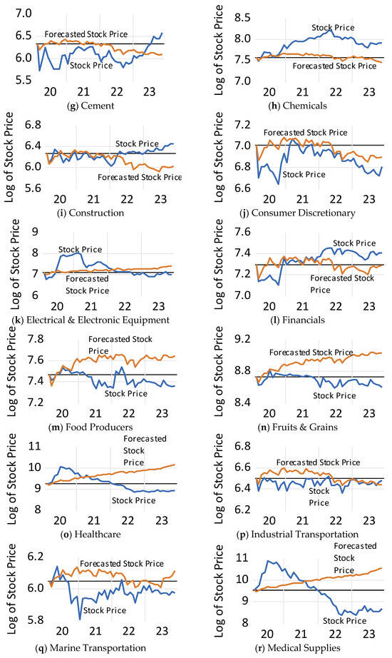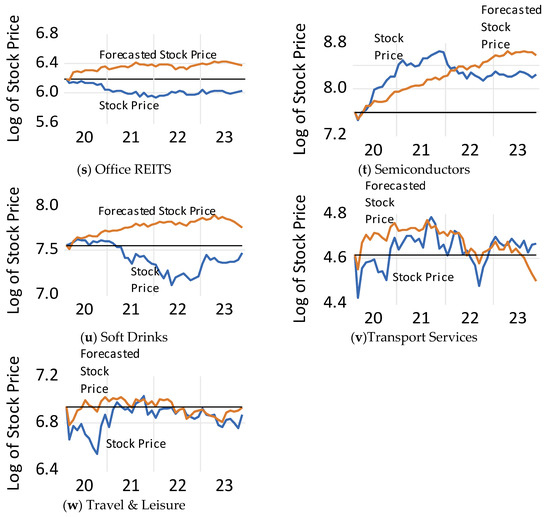 The first category includes medical supplies, healthcare, and semiconductors. Medical supplies stocks in panel (r) more than doubled in value between February and July 2020. Malaysia is a leading supplier of medical supplies (e.g., rubber gloves) and demand for these soared during the pandemic. Medical supply stocks then tumbled and fell logarithmically to more than 100% below their forecasted values by November 2023. Healthcare stocks in panel (o) closely mirrored the performance of medical supply stocks. Semiconductor stocks in panel (t) fell in March 2020 but then gained more than 100% as demand for information and communication technology devices by people working from home drove demand for semiconductors. Between November 2021 and November 2023, however, semiconductor stocks fell 40%. One problem facing the Malaysian semiconductor sector is that it is mired in low-value-added niches of the semiconductor industry, such as assembly and packaging (Wang and Lim 2023).