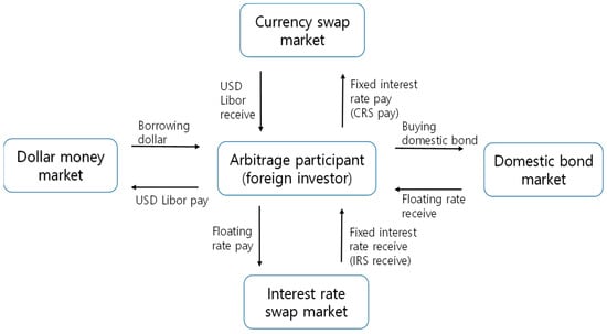 As shown in Figure 1, when foreign investors invest in domestic bonds, they acquire KRW through the currency swap market, paying the Currency Swap Rate (CRS) and receiving the London Interbank Offered Rate (Libor), taking a CRS payment position. This process results in an initial profit equal to the Swap Spread, which represents the difference between the domestic bond yield (variable rate) and the CRS rate. And then foreign investors take an IRS reception position in which they pay a floating interest rate accrued from domestic bonds and receive fixed interest rates through IRS (Interest Rate Swap) transactions. So, foreign investors investing in domestic bonds profit by subtracting the CRS from the IRS, that is, negative (−) the swap basis.