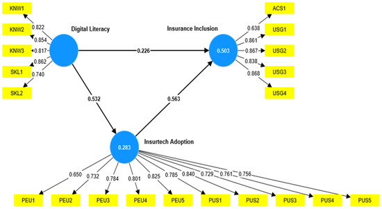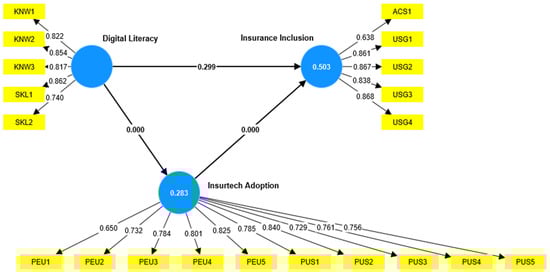 This study sought to establish the effect of digital literacy and insurtech adoption on insurance inclusion. Moreover, this study sought to establish the mediating role of insurtech adoption in the relationships between digital literacy and insurance inclusion in Uganda. As such, PLS-SEM was adopted to test the study hypotheses. PLS-SEM was adopted given its ability to perform exploratory and confirmatory statistical modelling for theory testing. According to Hair et al. (2019), PLS-SEM can estimate multivariate relationships while addressing the issue of measurement error. Furthermore, variance-based SEM was employed, given its predictive power compared to covariance-based SEM. The PLS-SEM results reveal that digital literacy significantly and positively (β = 0.226; t = 3.940; p < 0.0001) influences insurance inclusion in Uganda. A one unit change in digital literacy leads to a 0.266 positive change in insurance inclusion. This finding supports the hypothesis (H1). Furthermore, the findings reveal insurtech adoption has a significant positive impact (β = 0.563; t = 12.634; p < 0.0001) on insurance inclusion in Uganda. A one unit change in insurtech adoption leads to a 0.563 positive change in insurance inclusion. Hence, the hypothesis (H2) is supported. Additionally, the study’s findings reveal that digital literacy significantly and positively influences insurtech adoption in Uganda (β = 0.532; t = 13.526; p < 0.0001). A one unit change in digital literacy leads to a 0.532 positive change in insurtech adoption. Hence, the hypothesis (H3) is supported. Particularly, the results reveal that insurtech adoption partially mediates the relationship between digital literacy and insurance inclusion in Uganda (β = 0.299; t = 8.884; p < 0.0001). Significant portions (β = 0.299) of the direct effect of digital literacy go through insurtech adoption to influence insurance inclusion. The hypothesis testing results are presented in Table 5. Overall, the findings reveal that the direct and indirect effects of digital literacy and insurtech adoption explain 50.3% of the variance in insurance inclusion, as depicted in Figure 2 and Figure 3. According to Hair et al. (2019), an R2 of 0.26 and above shows a substantial effect of the predictors on the exogenous variable. Thus, it can be inferred that in the current model, digital literacy and insurtech adoption sufficiently predict insurance inclusion in Uganda.