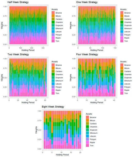 Figure 2 depicts the distribution of weights during both holding and rebalancing periods within the kurtosis minimization strategy. There was no significant imbalance observed across any of the depicted strategies. However, a notable observation is the presence of a white line in the figures corresponding to the half-, one-, and two-week periods. This occurrence in April 2022 occurred because kurtosis was not calculated for the portfolio due to the absence of movement in Litecoin’s price.