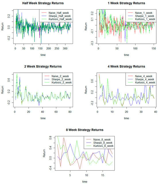 The findings from Table 2 and Table 3 indicate that the portfolio optimization method based on kurtosis minimization consistently outperformed others in the short term, particularly over holding periods of half a week, one week, two weeks, and four weeks, delivering optimal returns to investors. This observation aligns with the nature of cryptocurrencies, which are often traded in shorter terms, making kurtosis minimization particularly beneficial for capturing their market dynamics. This finding is corroborated by the literature, which emphasizes the importance of employing short-term strategies across various durations to construct comprehensive portfolios in cryptocurrencies. Each of these strategies serves a distinct purpose, enabling investors to tailor their approaches to different market conditions and optimize risk-adjusted returns.