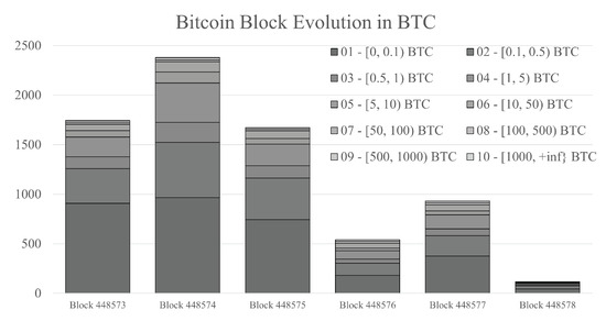 Each block in a Bitcoin blockchain contains all transactions that occur in approximately a rolling 10-min time window. The number of Bitcoin transactions occurring in each block, however, can vary significantly. Also, transactions can range in size from a fraction of a Bitcoin to a large number of Bitcoins. Because of this, Bitcoin transaction blocks are not uniform in composition and can differ in attributes such as the number and size of transactions. We further observe that Bitcoin blocks show interesting patterns when segmenting transactions in each block by transaction amounts. Figure 2 shows an example of how blocks evolve when transactions are segmented by transaction amount (in BTC).
