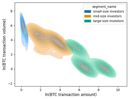 A rationale consistent with our Bitcoin market analysis is that different market participants respond to Bitcoin price movement in different ways and, in turn, also generate different effects on Bitcoin price. While these insights are similar to market segmentation present in financial equity markets, it is of particular importance to study the relationship between Bitcoin transactions and price movement given Bitcoin’s high volatility Blau (2017), its speculative nature, and the public accessibility of its transaction information. The transaction information also enables information transparency that is usually held by large financial institutions in traditional financial markets. This information can help future market participants make more rational decisions to optimize returns from Bitcoin markets. It is expected that Bitcoin price and transactions have a dynamic relationship similar to assets in the stock market (Gabaix et al. 2006). On the one hand, traders with small and large transaction amounts respond deferentially to price movement in the Bitcoin market, whereas on the other hand, trading behaviors can reflect (and even cause) price movement. Thus, we present three groups of participants, as seen in Figure 3: small investors (e.g., algorithmic traders), mid-sized investors (e.g., individuals), and institutional investors (e.g., individual whales). Figure 3 presents a contour map, where the x-axis represents the natural logarithm of transaction amounts, the y-axis represents the natural logarithm of the number of transactions in each block, and the contour lines and shading represent the total number of blocks. In this figure, we can see that the transactions show significant patterns and can be segmented into three segments: large transaction volume but small transaction amount, medium transaction volume and medium transaction amount, and low transaction volume but large transaction amount. These correspond to the three investor groups, which we describe next.