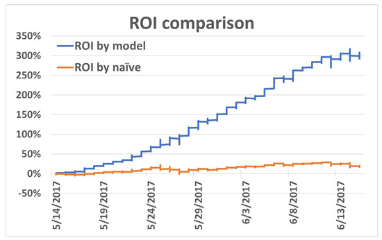 The trading strategy based on our model reached a total return on investment (ROI) of 305%, whereas the naive random-walk model only reached a total ROI of 20%, with both strategies starting with the same initial capital investment. Figure 4 shows how the ROI changed over time based on these two strategies. The x-axis in Figure 4 represents the time, and the y-axis represents the ROI percentage.
