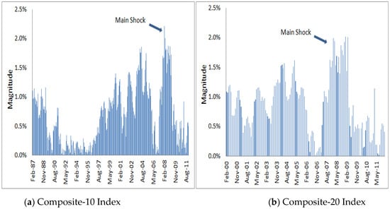 Table 2, we present the date of the mainshock occurrence, the magnitude of the mainshock, and the relative shock (the magnitude of the shock divided by the relative standard deviation). Most of the main shocks occurred in the month of February 2008, with the shock in the Las Vegas market being the largest.
