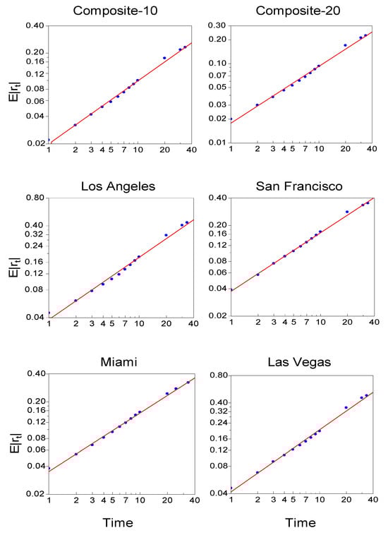 Figure 2, all points lie on a straight line, confirming that the empirical scaling law in all indices is a power law. It seems very encouraging that the power law holds for 1 to 34 months, a very long period which corresponds to almost a 3-year period.