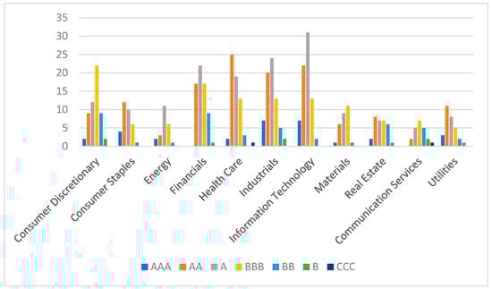 Figure 1 provides an overview of the distribution of companies sampled, showing the number of ESG ratings assigned to each of the AAA, AA, A, BBB, BB, B, and CCC categories for the eleven sectors of the S&P 500 included in our analysis.