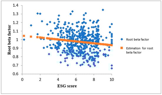 Next, we consider the estimated constant, computed as 1.046. It follows that an ESG score of zero yields by the model an estimated root beta of 1.046. The slope parameter is equal to −0.0112, which means that a one unit increase in the ESG score leads to a 0.0112 unit decrease in the root beta. The estimate for the root beta is shown on the scatterplot of Figure 3. The estimated visualization can be improved by more comprehensible scaling using an inverse transformation of the estimates. Currently, the estimate takes the following form: