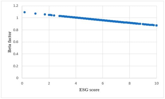 The next step is to test for linearity between the ESG rating and beta, for which we use the Pearson correlation coefficient matrix presented in Table 3. This shows that there is a negative linear correlation with a small effect of −0.15 between the ESG rating and the firm’s beta. This suggests a company with a good ESG rating also has a lower beta.