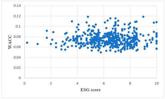 Our first step of evaluating the descriptive statistics reveals that a good ESG rating does not lead to a lower WACC. We confirm this by checking for a linear relationship between the WACC and the ESG score using the correlation coefficient; with a value of 0.04, the coefficient indicates no effect. Figure 5 plots a featureless cloud of points for the WACC and the ESG rating. Transforming the data makes no sense, as there is already a very low correlation coefficient that would only improve minimally. It follows that performing a linear regression analysis would not make sense.