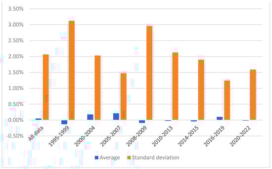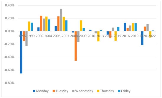 As can be seen, the only day when price dynamics were consistently positive (prices increased) was Friday, aligning perfectly with the classical day-of-the-week effect. Regarding another classical feature of the day-of-the-week effect—price declines on Mondays—this effect was vividly observed only in the first and last of the analyzed periods (1995–1999 and 2020–2022, respectively). For the rest of the days, the data were mixed. In certain periods, the dynamics on specific days appeared anomalously strong compared to other days. For instance, the price decline on Tuesdays during the 2008–2009 period, in absolute terms, was several times greater than the average dynamics on any other day of the week.
