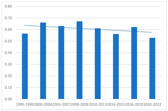 As an additional method to validate the obtained results, regression analysis with dummy variables is employed. In the regression model, Variable X1 represents the coefficient of a dummy variable. The dummy variable takes the value of 1 when the data belongs to a certain period (e.g., 1995–1999, 2000–2004, etc., as indicated in column 1), and 0 otherwise. A p-value below 0.05 indicates statistical differences between a specific period from column 1 and the overall data set. The results are presented in Table 6.