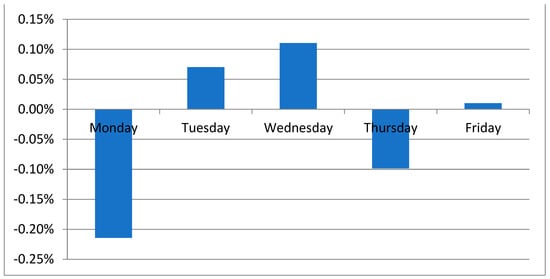 Considering the specifics of the data used in this study (daily data over 2–5-year periods), it is impossible to analyze most anomalies due to their requiring a different data periodicity (monthly, for example) or a larger data set. However, some anomalies can be explored with statistically significant results. One such anomaly is the day-of-the-week effect—one of the most well-known calendar anomalies studied on various markets (stock, currency, commodity, cryptocurrency) in different countries (U.S., Japan, China, etc.) and groups of countries (developed, emerging).