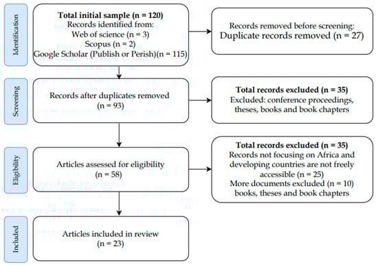 Apart from removing duplicates, we made various inclusions and exclusions. Thus, the review only included peer-reviewed articles. As a result, we excluded conference proceedings, theses, books and book chapters. Furthermore, only freely accessible articles focused on African or developing countries were selected. Furthermore, Boell and Cecez-Kecmanovic (2015) noted that, even as researchers follow protocol when applying the inclusion and exclusion criteria, this too depends on researchers’ subjective judgment and understanding of the topic.