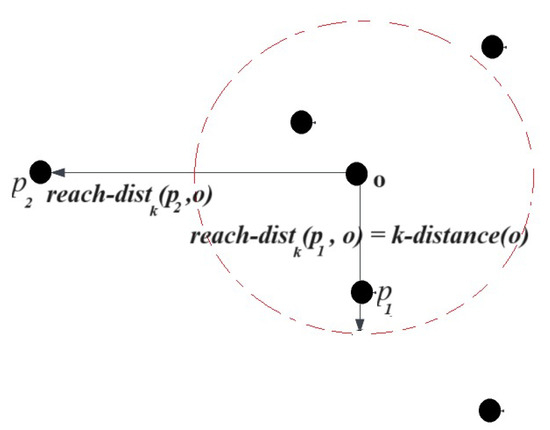 Figure 2 shows an illustration of the reachability distance with . When the object, p, is significantly far from O, the reachability distance is measured as the actual distance between the object and O, which is depicted by the distance, , in the figure below. However, if the object, p, is sufficiently close to O or located within the k-distance radius, then the k-distance of O becomes the reachability distance.