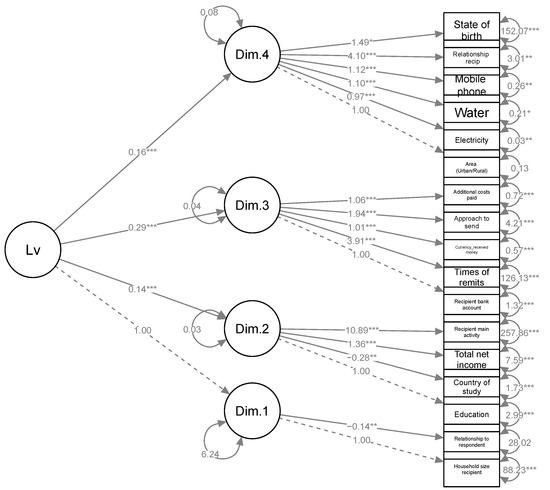 The latent variable (LV) depicts the suspicion level of terrorism associated with the recipient transaction. This latent variable, LV, is directly influenced by four endogenous variables: , which represent the socioeconomic factors, as explained in the model’s conceptualization. The latent variables, and , represent the socioeconomic factors measured by the independent exogenous variables: the recipient household size, education level, total income earned, relationship to the respondent, and country of study. The economic latent factor variable, , has exogenous measurement variables: the recipient’s bank account, the frequency of remittances, the currency in which remittances are received, and additional costs associated with the financial transfer. These exogenous variables measure the economic latent factor strain, as it determines the recipient’s access to financial services. The latent variable, , indicates geographical factors, including place of residence (rural/urban), and access to basic amenities (electricity and water). All of the variables used in the construction of the latent variables had a significant effect (p value < 0.05 *, < 0.01 **, < 0.001 ***), as shown in the path diagram (Figure 3).