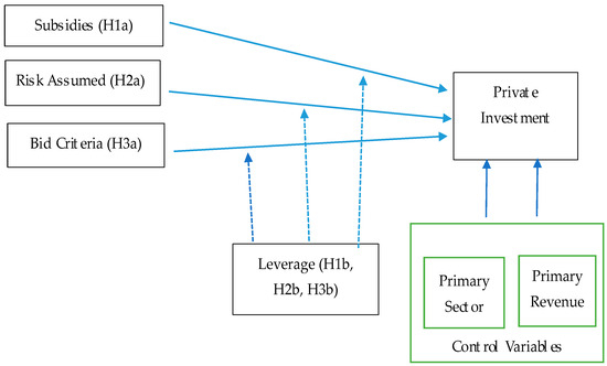 Our model helps in testing the relationships between subsidy, assumed risk, bid criteria, and private investment (PI) as dependent variables. PI, as noted before, is a key component of PPPs, and is especially significant in emerging markets. Without the support of private players, governments often find it difficult to develop infrastructure projects. Therefore, governments in emerging markets highly incentivize and look to provide all kinds of direct and indirect support to private investors. A high PI can be used as a surrogate measure of project attractiveness. It also represents a commitment to, as well as confidence in, the success of a PPP from the private partner’s perspective. In order to enhance the internal validity of the study (Becker 2005), we controlled for the sector in which these projects were operational and the primary revenue sources (Wang et al. 2019b).