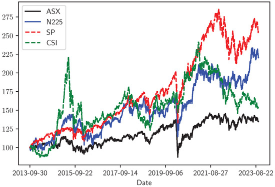 For illustrative purposes, Figure 1 displays the stock indices during the sample period from 1 October 2013, to 30 September 2023, with values normalized such that the value on 1 October 2013, is set to 100. It is evident that all indexes experienced significant fluctuations during the COVID-19 crisis.