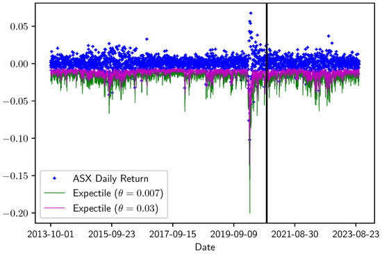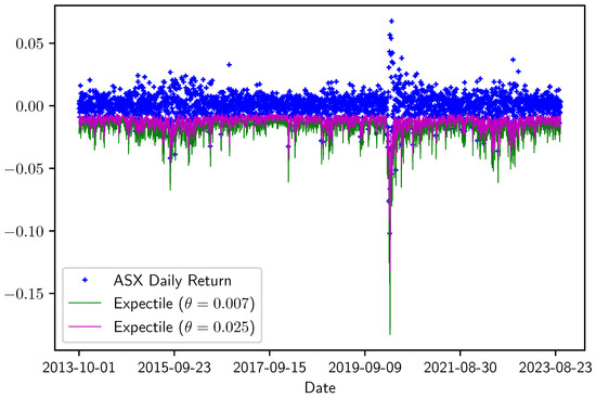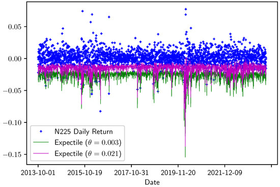 For the expectile regression, the corresponding is calculated according to Equation (6) for a given (1% or 5% in this paper). The final expectile regression results for the ASX 200 and Nikkei 225 indexes are reported in Table 2.