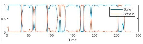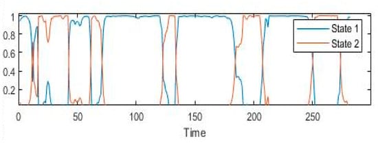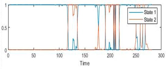 Moreover, these models have assumed significant roles within econometric time series analyses. For example, () harnessed the MS-VAR to unveil the intricate transmission mechanism of a positive shock within the EONIA index to Greek banks’ retail rates, a process that necessitated an evaluation of its stochastic factors. In a different context, () utilized the MS-VAR model to dissect the repercussions of the U.S. economic policy uncertainty index and oil price fluctuations on the dollar exchange rate, utilizing monthly data from January 2006 to August 2020. Adding to that, () adopted the MS-VAR model with dual regimes to explore the influence of global oil price shocks on the Tehran Stock Exchange. His investigation revealed varying intercepts, coefficients, and variances within each regime. The matrices that depict transition probabilities offer insight into the persistence of both states, indicating that shocks evoke both positive and negative effects on the Tehran Stock Exchange within the respective first and second regimes.