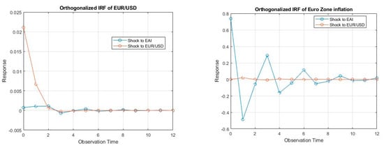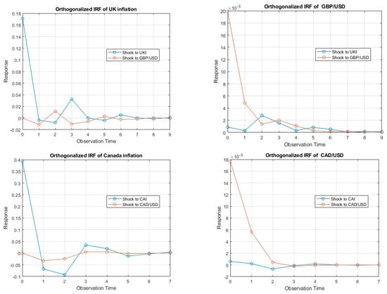 Shifting our focus to the exchange rate’s response, a distinct pattern emerged. The reaction of the exchange rate to an inflation shock was not immediate, manifesting as a minor dip in exchange rates, particularly evident in GBP/USD and CAD/USD. Over time, the influence of the inflation shock waved, consistent with the observed decay effect. Transitioning to the second column of images, which depict the response of variables to a shock in the exchange rate, the response of exchange rates following an exchange rate shock was immediate and robust in the initial period. However, this sharp response rapidly diminished in the subsequent period, effectively nullifying the impact by the third period.