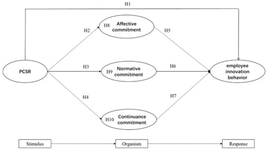 This study explores the relationships between employees’ PCSR, organizational commitment and innovation behavior based on the stimulus–organism–response (S-O-R) theoretical framework. Mehrabian and Russell (1974) proposed the S-O-R framework based on stimulus–response theory, positing that environmental stimuli influence an individual’s internal state, affecting their behavior. The S-O-R framework provides insights into how stimuli shape internal states in the human environment and influence responses represented by behavior (Chen and Zhang 2023). According to the S-O-R theory, changes in internal drives and mechanisms brought about by external stimuli determine human behavior (Pandita et al. 2021). When individuals receive stimuli, internal psychological processes are activated, leading to behavioral changes (Ferdous et al. 2021). Under certain stimulus conditions, a person typically generates corresponding subsequent behaviors mediated by an internal state (Ahmad et al. 2021). In other words, the organism often acts as an intermediary between stimulus and response (Bigne et al. 2020).