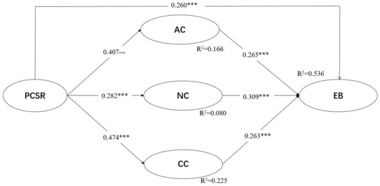 To validate these hypotheses, we first conducted a path analysis. Table 6 and Figure 2 display the path coefficients and significance levels. The analysis results show that PCSR had a significant positive impact on EB, thus supporting H1. Additionally, PCSR had a significant positive impact on AC, NC and CC, with PCSR having the strongest impact on continuance commitment. These result supports hypotheses H2, H3 and H4. AC, NC and CC also had significant positive impacts on EB, with normative commitment having the strongest impact on employee innovation behavior, thus supporting hypotheses H5, H6 and H7.