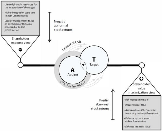 The latter argument also paves the way for linking M&A success with CSR performance. M&A deals are essential investment decisions that can substantially impact shareholder value. However, it could be unclear whether this effect is positive or negative against the background of the two competing theories, namely the shareholder expense view and the stakeholder value maximization view. We summarize the competing opinions in Figure 1 and elaborate on them in the following.